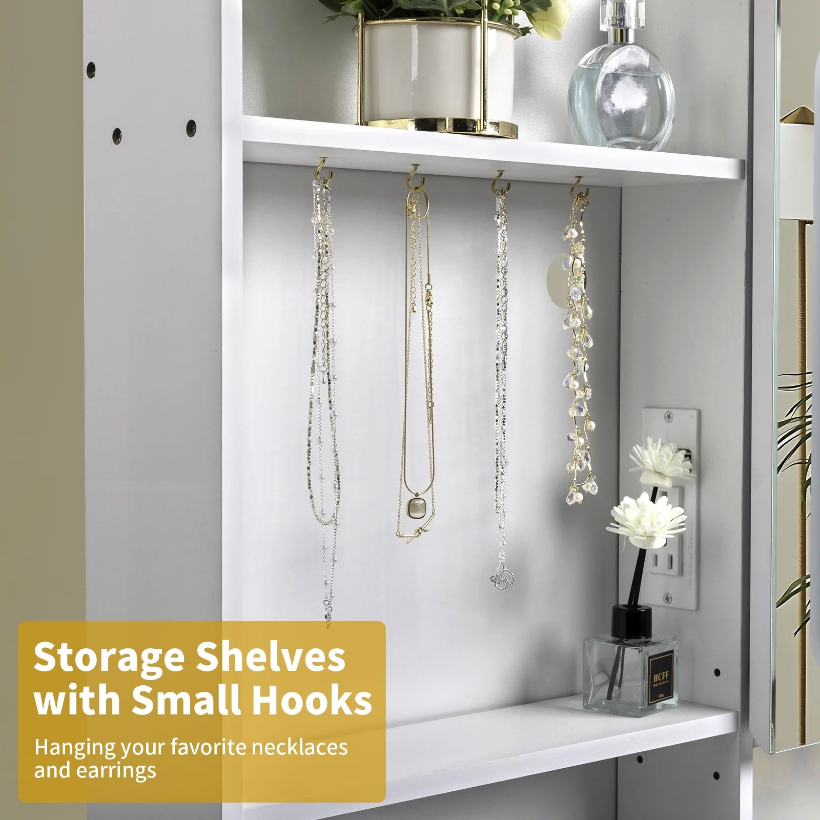 • The hooks on the storage shelf for hanging your necklaces and earrings