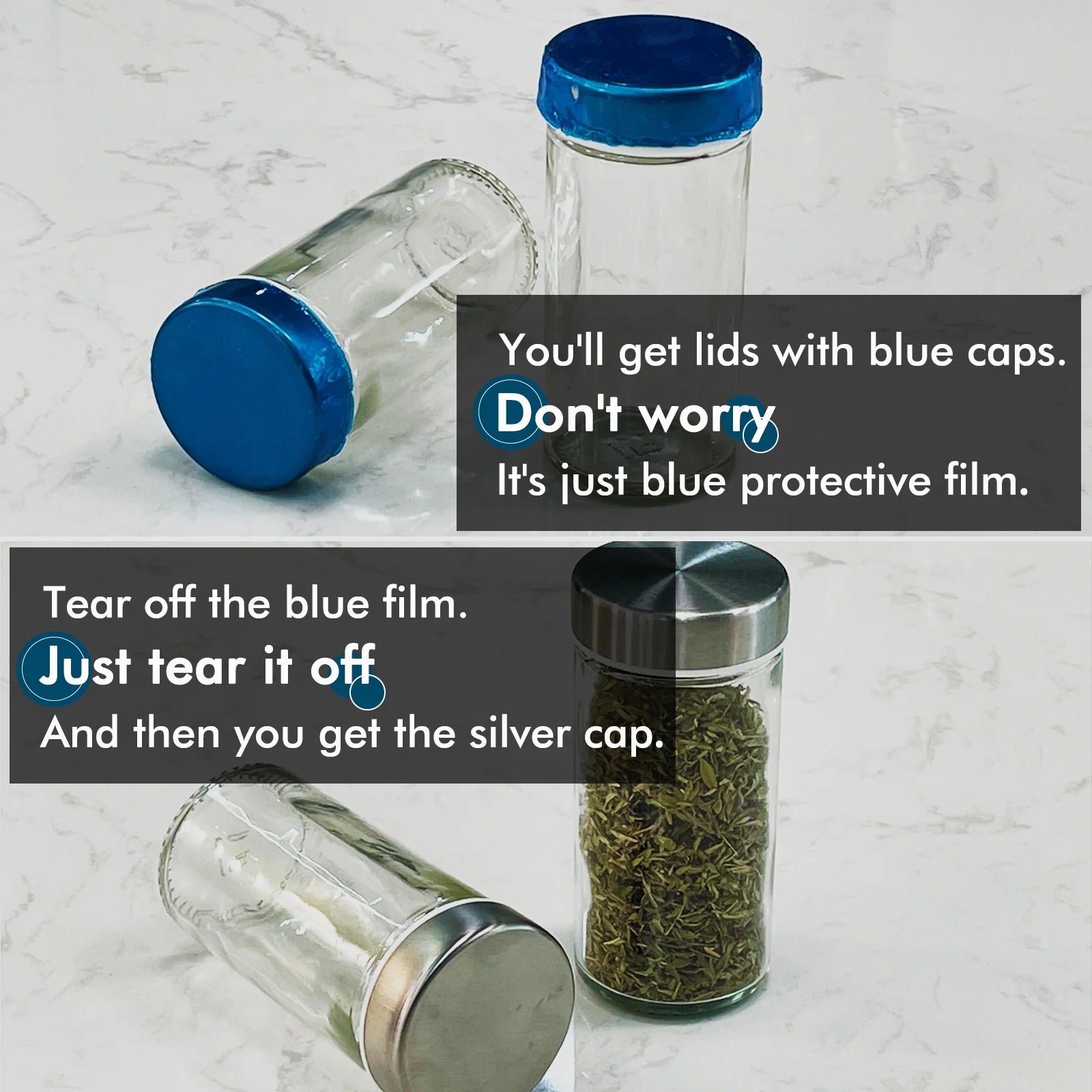Premium Safe Material - Heavy duty glass spice bottle jars are food grade material. To prevent the lids from being scratched, it’s sealed with blue protective plastic film. You’d better tear them off. with a stainless steel lip, You can turn the lid to use, or you can close it to keep your spices fresh.