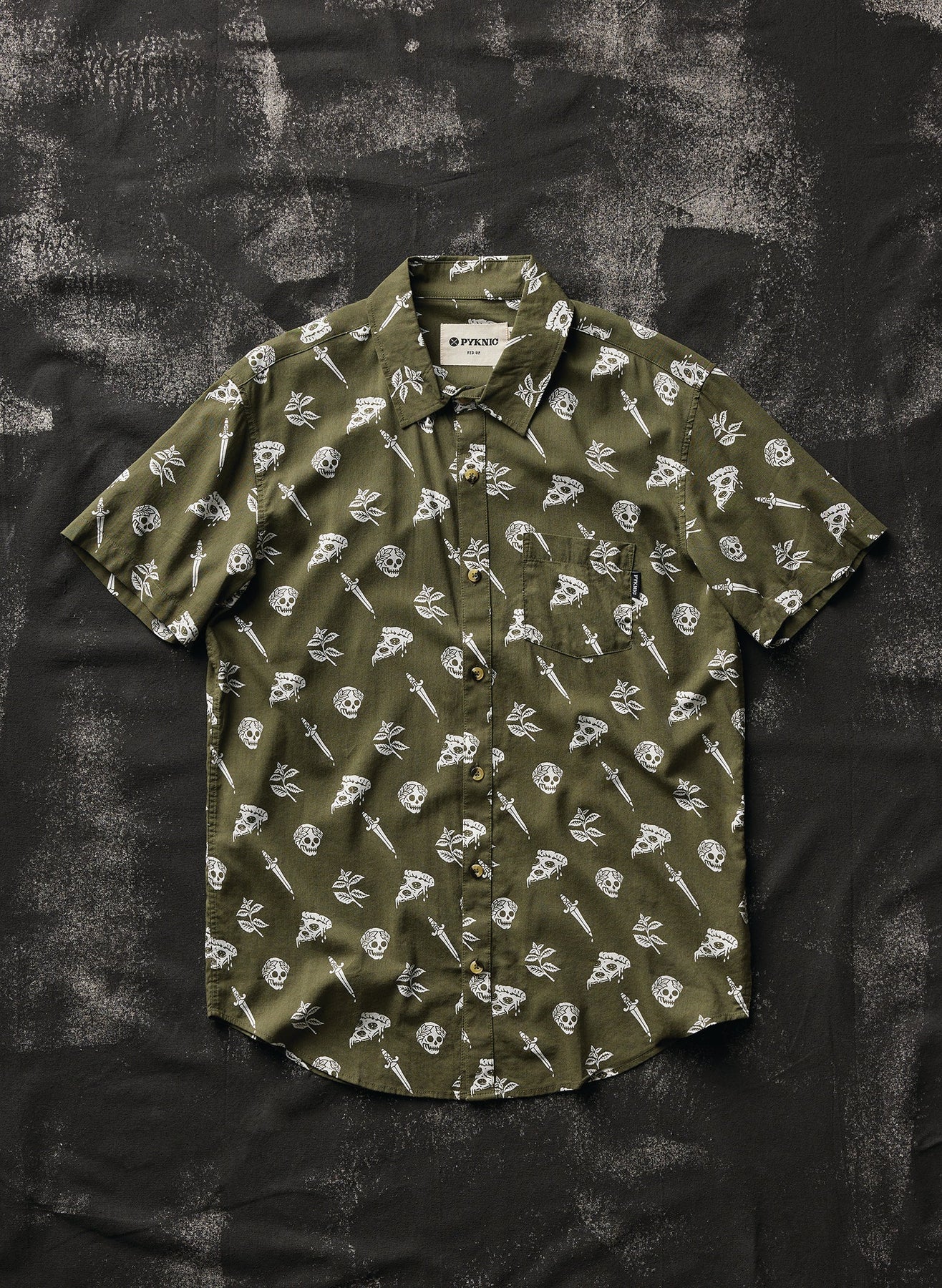 The Pizza Slayer is a fun cut-n-sew button-up shirt. The olive green colored casual shirt features a bold all-over print of pizza, swords, oregano, and Caesar skulls. Stay sophisticated while not-so-subtly letting everyone know you'd kill for some good pizza.