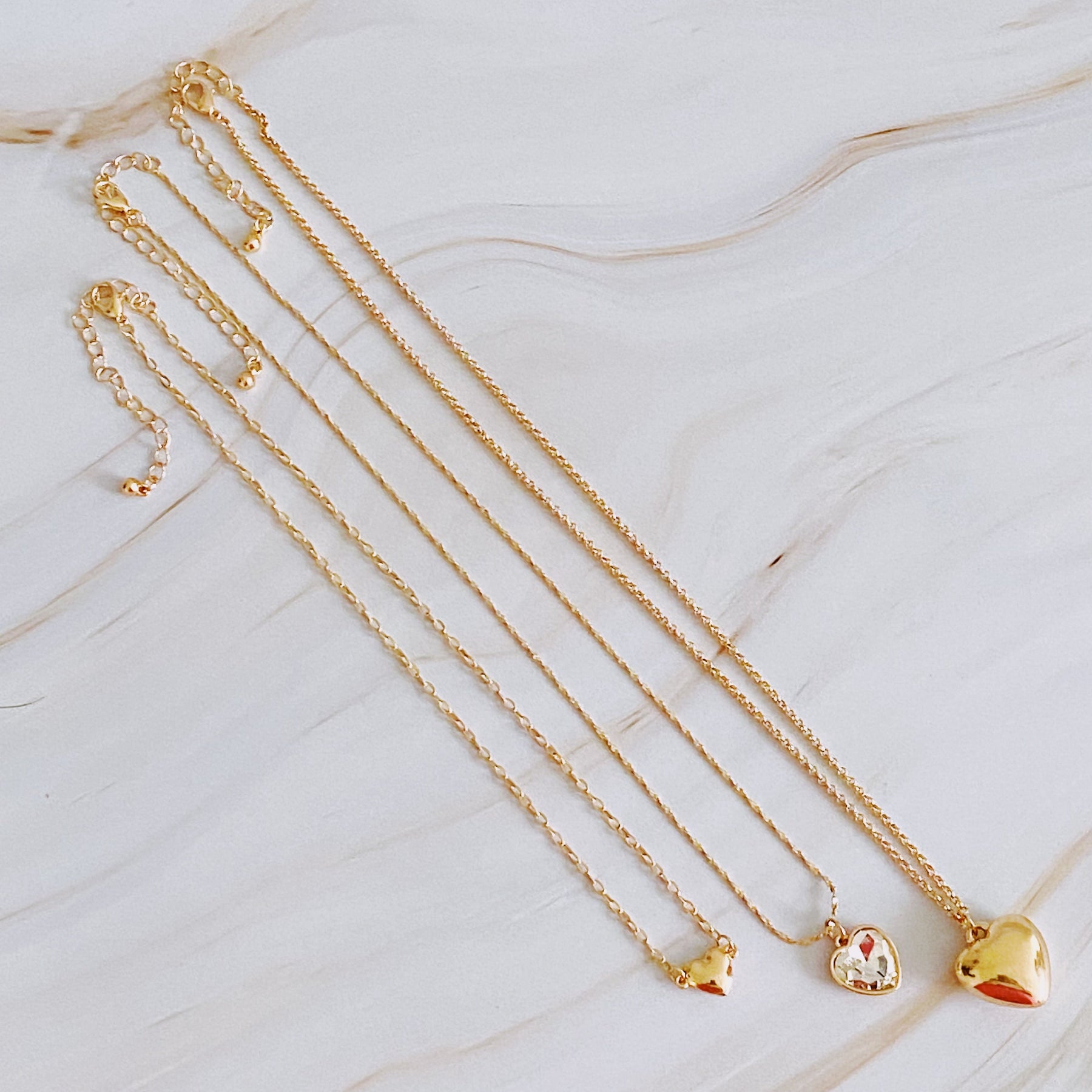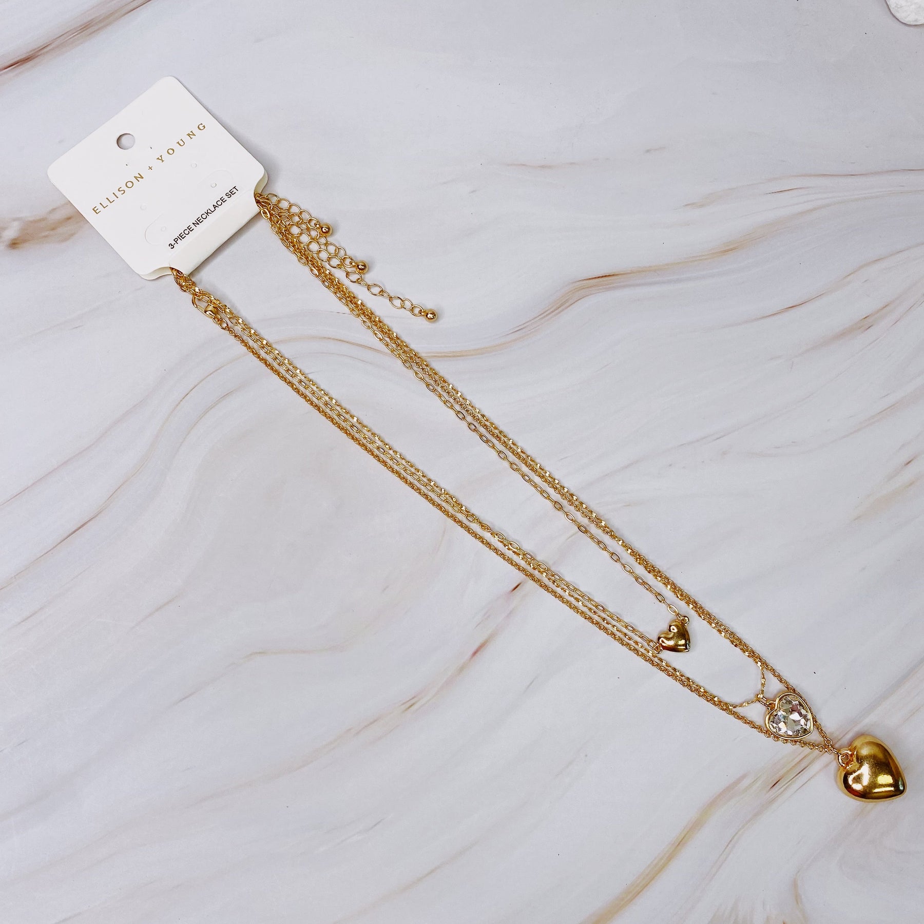 This triple heart pendant necklace set includes three unique necklaces; one small, one medium, and one large. Each necklace features a heart-shaped pendant, ranging from short to long chain lengths, making it perfect for layering. Add a touch of elegance to your outfit with this sweet set!